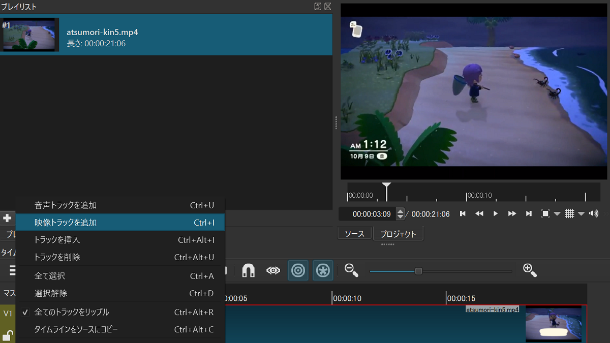 プレイリストからタイムライン(トラック)へ素材(画像)を入れる。